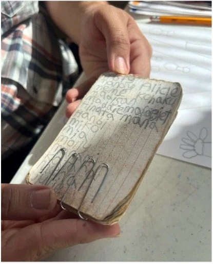 “My favorite thing to do at Creative Clay—okay, well, my favorite thing to do anywhere—is to work on my characters. Usually, I draw one, then I make up its name. Sometimes, I look at my list of names first.” Marcus pulls out a small stack of notes, held together with giant paper clips and filled with names. “The hardest part of all is coming up with a new name every time.”