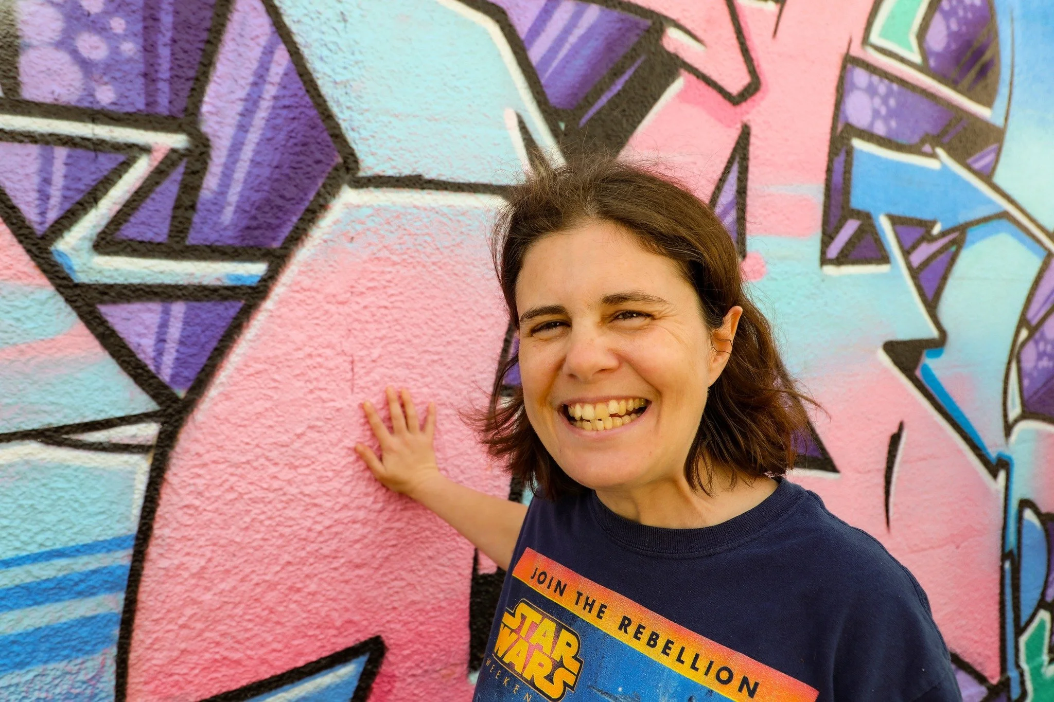Stephanie is photographed in front of a local mural during a photo safari
